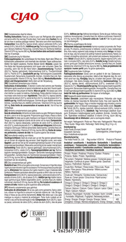 Analytische Bestandteile: Rohprotein (min) 7%, Rohfett (min) 0,8%, Rohfaser (max) 0,3%, Feuchtigkeit (max) 88%, DHA (min) 0,04$, EPA (min) 0,04%, Kalzium (min) 0,3%, Vitamin E (min) 310IU/kg, Taurin (min) 0,025%.